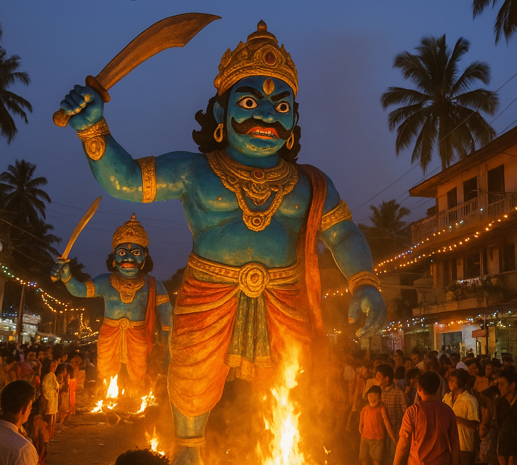 On the eve of Diwali, huge effigies of Narakasura are created in every town and village. These colorful and often fierce-looking models are built by local youth using bamboo, hay, paper, and paints. As dawn approaches, these effigies are paraded through the streets and finally set on fire, marking the destruction of evil. The sight of flames lighting up the early morning sky is both dramatic and symbolic — a moment of celebration and reflection.